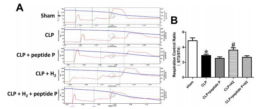 手術(shù)6小時(shí)后,分離肝臟線粒體并評估線粒體呼吸水平(圖6A)。RCR級別CLP組小鼠的減少與CLP組相比假手術(shù)組(圖6B),但2%H2處理改善了CLP+H2組小鼠的RCR水平(圖6B)。CLP+肽P組和CLP+H2+肽P組的小鼠之間沒有統(tǒng)計(jì)學(xué)差異(圖6B)。