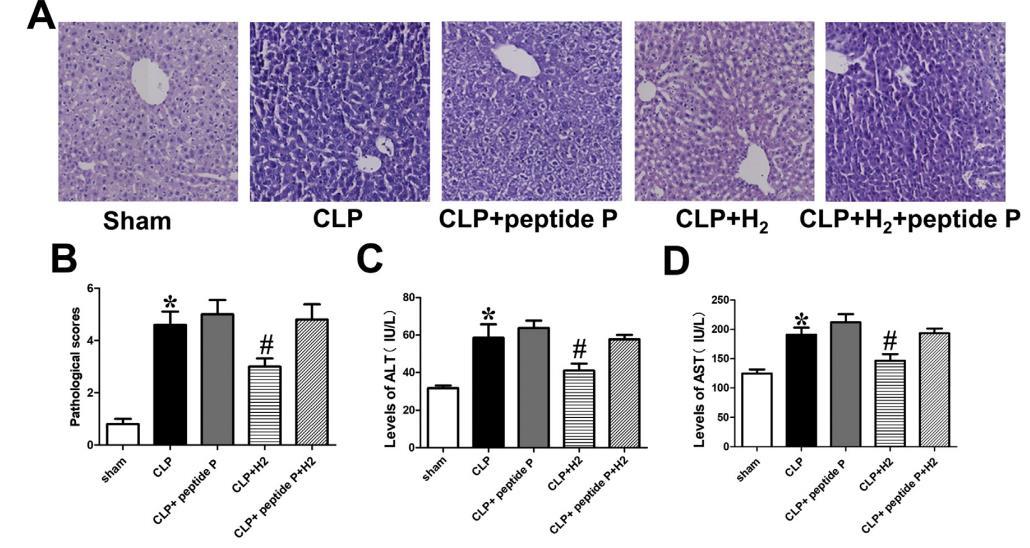 我們使用HE染色法評估假手術(shù)或CLP手術(shù)后6小時(shí)肝組織的組織病理學(xué)變化(圖5A)。正常小鼠的肝組織沒有明顯變化。在CLP組,大面積肝小葉出現(xiàn)了與肝損傷相關(guān)的形態(tài)學(xué)變化,包括斑點(diǎn)狀壞死和囊膜炎。然而,與CLP組相比,CLP+H2組小鼠的損傷明顯減輕(圖5B)。此外,血清樣本中的谷丙轉(zhuǎn)氨酶(ALT)和谷草轉(zhuǎn)氨酶(AST)水平也用于評估肝損傷狀況。與假組小鼠相比,CLP組小鼠的谷丙轉(zhuǎn)氨酶和谷草轉(zhuǎn)氨酶水平明顯升高(圖5C和D),而吸入2%H2組小鼠的谷丙轉(zhuǎn)氨酶和谷草轉(zhuǎn)氨酶水平明顯下降(圖5C和D)。然而,CLP+肽P組與CLP+H2+肽P組之間的病理評分和ALT、AST表達(dá)無統(tǒng)計(jì)學(xué)差異(圖5B-D)。因此,肽P可以抑制H2對敗血癥小鼠肝損傷的治療作用。