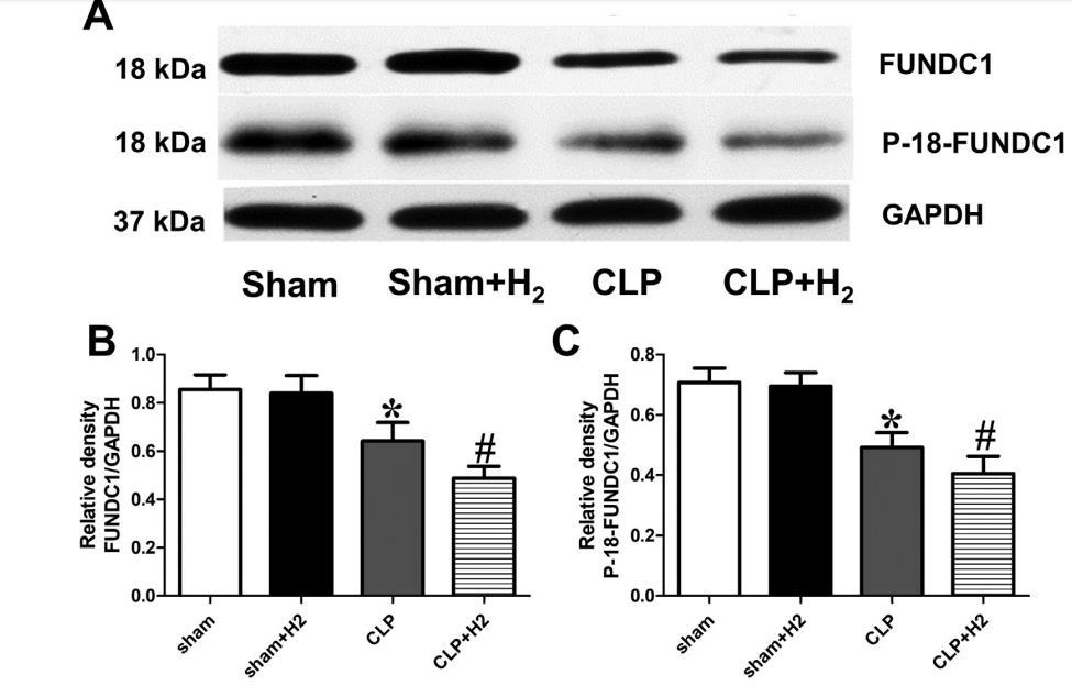 手術(shù)后6小時(shí),用Western印跡法評估FUNDC1和p-18FUNDC1的蛋白水平(圖3A)。盲腸結(jié)扎組小鼠的FUNDC1和p-18-FUNDC1水平低于假組(圖3B-C)。然而,與中性粒細(xì)胞白蛋白組相比,2%H2處理可降低中性粒細(xì)胞白蛋白+H2組小鼠的FUNDC1和p-18-FUNDC1表達(dá)水平(圖3B-C)。