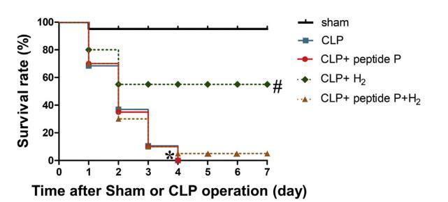 在為期7天的實(shí)驗(yàn)觀察中,假組只有一只小鼠死亡。此外,與假組相比,盲腸結(jié)扎組小鼠的7天存活率明顯下降。與CLP組相比,CLP+H2組在吸入2%H2后的7天存活率明顯提高。然而,CLP+肽P組和CLP+H2+肽P組之間沒有統(tǒng)計(jì)學(xué)差異(圖4)。