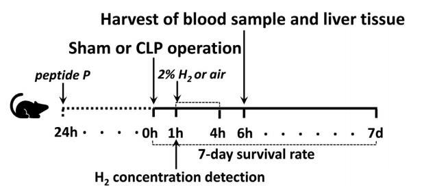 圖1:實(shí)驗(yàn)設(shè)計(jì)。雄性C57BL/6J小鼠(6-8周大,體重20-25g)接受假手術(shù)或CLP手術(shù)。我們使用2%的氫氣(H2)或新鮮空氣處理小鼠,從假性或CLP手術(shù)后1小時(shí)開始,持續(xù)3小時(shí)。為了驗(yàn)證FUNDC1的關(guān)鍵作用,我們在CLP或假手術(shù)前24小時(shí)給小鼠腹腔注射細(xì)胞穿透肽P(一種FUNDC1抑制劑);其他組則注射相同體積的生理鹽水。在假手術(shù)或CLP手術(shù)后6小時(shí)收集各組小鼠的血清樣本和肝組織。