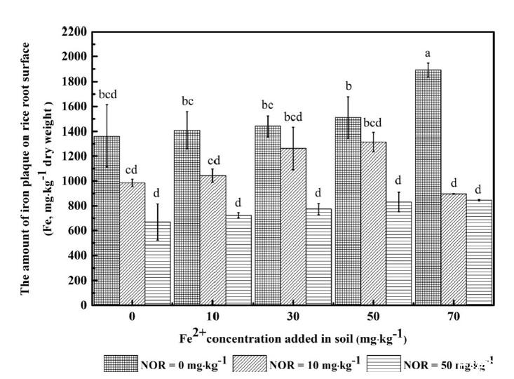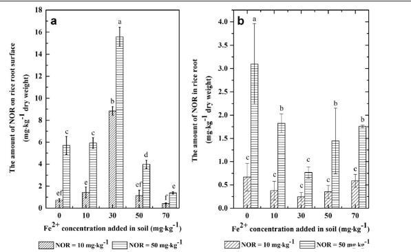圖2、根表(a)和根內(b)的NOR濃度。(a)根表鐵膜中NOR的積累量隨Fe(II)添加量增加呈先升后降趨勢,在Fe(II)為30 mg·kg?1時最高。(b)根內NOR濃度與根表相反,在Fe(II)為30 mg·kg?1時最低,表明鐵膜對高濃度NOR(50 mg·kg?1)具有屏障作用。