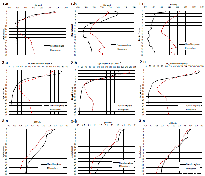 圖5、根際與非根際土壤的Eh、pH和O?剖面分布。1-a、2-a、3-a:無Fe(II)和NOR;1-b、2-b、3-b:無Fe(II)+50 mg·kg?1NOR;1-c、2-c、3-c:70 mg·kg?1Fe(II)+50 mg·kg?1NOR。Eh(氧化還原電位):根際土壤Eh顯著高于非根際,Fe(II)添加進一步擴大差異。O?濃度:根際O?因根系泌氧而升高,NOR單獨處理會降低根際O?。pH:根際pH低于非根際,源于根系分泌有機酸和H?。