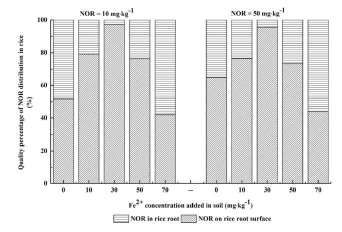 圖3、NOR在水稻根表與根內的分布比例。根表NOR占比在Fe(II)為30 mg·kg?1時最高(達97.3%),隨后下降;根內占比則呈相反趨勢。表明鐵膜對NOR的固定作用在適量Fe(II)下最強。