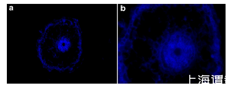 圖4、根橫切面的熒光顯微鏡分析(×10和×40放大)。NOR(藍色熒光)主要分布在根表鐵膜、表皮層和中柱,皮層中較少。NOR僅存在于細胞外空間(質外體途徑),未進入細胞內部。
