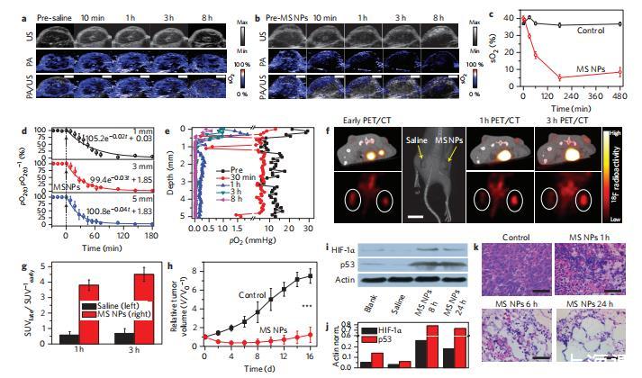 然后,在雙側4T1異種移植腫瘤小鼠身上評估了MS NPs作為體內DOA用于腫瘤饑餓療法的潛在資格,在右側腫瘤內注射MS NPs,在左側腫瘤內注射生理鹽水作為對照。通過多波長光聲(PA)和B型超聲(US)圖像的聯合注冊,實時定量監測瘤內血氧飽和度(sO2)的變化,即血紅蛋白結合氧的水平。對照組的sO2值幾乎保持不變,約為37%,與注射前持平(圖5a,c),這證實了4T1實體瘤在此期間的輕微缺氧性質,以及生理鹽水本身對瘤內sO2的影響微乎其微。值得注意的是,從注射MS NPs十分鐘后開始,sO2就急劇下降,這種下降趨勢一直持續到三小時,瘤內血氧幾乎被完全清除(圖5b、c),這表明HbO2被有效脫氧。同時,金標準氧微電極顯示,腫瘤組織中溶解的游離氧也同樣被徹底清除(圖5d、e)。瘤內溶解氧原始微輪廓的明顯波動表明,實體瘤中的氧分布是不均勻的,而在注射MSNP后,這種不均勻性被大幅消除,達到了持久的零氧張力。從理論上講,細胞生長的有利微環境主要依賴于血紅蛋白結合氧和組織內溶解氧之間的平衡,因此腫瘤內這兩種氧的完全耗竭將不可避免地導致嚴重缺氧以及隨后的細胞壞死和凋亡。