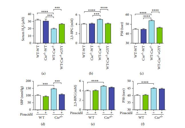 圖1:硫化氫水平降低導致Cse-/-小鼠紅細胞中2,3-BPG生成增加和Hb-O2親和力下降。野生型和Cse-/-小鼠分別給予生理鹽水或GYY4137(133μmol/kg)。(a–c)注射24小時后分離紅細胞以測定2,3-BPG水平(a)和氧解離曲線((b)P50值;(c)氧解離曲線的代表性跡線)。數據以均值±標準誤表示(n=10)。***p<0.001,*****p<0.0001。