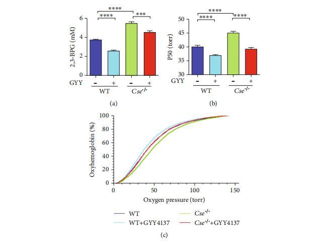我們使用Cse-/-小鼠探索了硫化氫在紅細胞中的功能作用,因為Cse-/-小鼠顯示出顯著降低的硫化氫水平。通過代謝組學技術,我們在紅細胞中鑒定出98種代謝物,并發現與野生型小鼠相比,Cse-/-小鼠的多個代謝途徑(如丙酮酸代謝、糖酵解或糖異生)發生了顯著變化。值得注意的是,與野生型小鼠相比,Cse-/-小鼠紅細胞中的代謝物中2,3-BPG顯著升高。隨后通過分光光度法測定證實了Cse-/-小鼠紅細胞中2,3-BPG水平的升高(圖1(a))。由于2,3-BPG是一種特異性變構調節劑,可調節Hb-O2親和力,我們檢測了Cse-/-小鼠的氧解離曲線。如預期,與野生型小鼠相比,Cse-/-小鼠的50%氧飽和度(P50)值顯著升高了4至6 mmHg(圖1(b)和1(c))。為確保Cse-/-小鼠中2,3-BPG和P50水平的升高是由于硫化氫生成減少所致,我們用緩釋硫化氫供體GYY4137處理了Cse-/-小鼠。如圖1(a)–1(c)所示,GYY4137(133μmol/kg)處理導致2,3-BPG和P50水平降低。