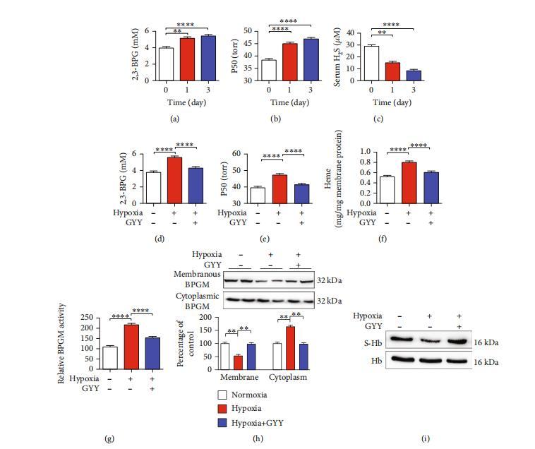 降低循環硫化氫水平有助于增加缺氧性腦損傷小鼠紅細胞中的2,3-BPG和P50水平。與先前的缺氧結果一致。研究顯示,小鼠在缺氧條件下,紅細胞2,3-BPG水平在一天內升高,并在缺氧持續3天期間保持高水平(圖8(a))。此外,P50在缺氧一天后增加約15%,并在缺氧第三天繼續上升(圖8(b))。我們還檢測了小鼠在缺氧刺激下循環系統中硫化氫的水平。如圖8(c)所示,缺氧期間循環系統中的硫化氫水平在第一天顯著降低,并在第三天進一步減少。紅細胞、肝臟和腎臟中的CSE表達水平在缺氧期間也顯著降低。有趣的是,GYY4137處理逆轉了缺氧引起的紅細胞2,3-BPG和P50水平升高(圖8(d)和8(e))。隨后,我們測試了缺氧對紅細胞膜Hb含量、胞質BPGM活性以及BPGM從膜到胞質轉運的影響,以及缺氧期間硫化氫干預的效果。如預期,與正常氧環境下的小鼠相比,缺氧暴露組小鼠的紅細胞中血紅素含量顯著升高(圖8(f))。與此一致的是,缺氧組小鼠紅細胞的胞質BPGM活性顯著增強(圖8(g)),而膜BPGM水平顯著降低,胞質BPGM水平則顯著升高(圖8(h))。在缺氧條件下,GYY4137處理可降低紅細胞膜血紅素含量,同時提升胞質BPGM活性和膜BPGM水平,降低胞質BPGM水平(圖8(f)–8(h))。此外,缺氧組小鼠的血紅蛋白硫水合水平降低,而GYY4137處理可逆轉這一現象(圖8(i))。