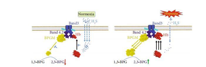圖9:硫化氫在常氧和缺氧條件下調節2,3-BPG和Hb-O2結合親和力的潛在機制整合方案。硫化氫抑制Hb從細胞質向膜的轉運,進而促進BPGM錨定于膜上,從而防止常氧條件下2,3-BPG水平的升高。在缺氧期間,硫化氫水平的降低促進了Hb錨定于膜上,并促使BPGM從膜上釋放到細胞質中,最終導致紅細胞中2,3-BPG生成的增加。