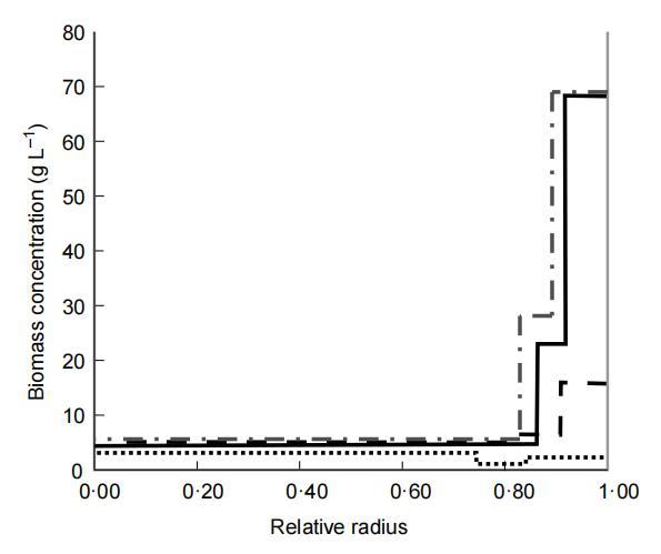 最初,珠包含均勻分布的生物量。在連續發酵的前12小時內,生物量分布發生變化,因為珠最外層的生物量濃度比珠中心增加更多。發酵12小時后,珠最外層約150μm厚的層包含約73%的生物量。生物量濃度似乎不隨發酵延長在此層進一步增加。在連續發酵48小時后分析的珠中,約73%的生物量位于珠最外層180μm內。然而,在珠較深層也觀察到生物量濃度的輕微增加。在珠中心,生物量濃度在5.5至48小時發酵期間未觀察到變化。