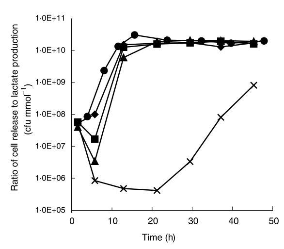 為了確定觀察到的細胞釋放減少是否實際由于減少細胞釋放而非僅代謝活性降低的后果,細胞釋放速率與乳酸生產速率的比值在發酵期間間隔如圖6所示。