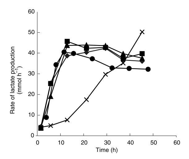 珠內生物量濃度和流出物中乳酸濃度在同一間隔測定。珠內細胞密度在發酵期間的時間過程如圖4所示,而觀察到的乳酸生產速率如圖5所示。