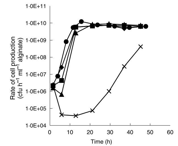 由于乳酸菌的生長伴隨乳酸生產,不同尺寸珠的結果表明大多數乳酸菌生長位于珠最外部。由于珠最外層生物量濃度似乎穩定,該區域的生物量生長可能釋放到周圍介質中。根據先前研究,珠內部生物量被未解離乳酸和低pH抑制。因此,升高周圍介質pH可能用于影響珠內生物量分布和隨后細胞釋放,通過促進珠內部生長和抑制外圍生長。為了研究這個想法,記錄了L.lactis亞種lactis在給定培養基中不同控制pH值下的生長速率。基于這些實驗,在固定化細菌連續發酵實驗中使用以下pH值:6.5、8.50、8.75、9.00和9.25。所有發酵在發酵前2小時在pH 6.5下運行,以在珠中建立保護性pH梯度。細胞釋放速率,監測為自由細胞生產速率,在發酵期間各種間隔測定。每個發酵的自由細胞生產速率如圖3所示。