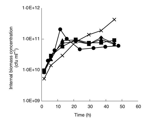 固定化細菌從鈣藻酸鹽珠的釋放與細菌在珠中的生長相關。隨著細菌生長,珠中生物量分布發生變化。為了研究這些變化,包含固定化L.lactis亞種lactis NCIMB 6681的珠在控制pH 6.5下連續發酵,并在不同發酵時間收獲進行生物量分布分析。珠在開始和連續發酵5.5、12和48小時后的生物量分布如圖1所示。