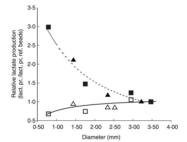 生物量的代謝活性及其在珠內的分布通過監測乳酸生產速率進行研究。使用直徑在1.4至3.5 mm之間的各種珠以研究珠尺寸對乳酸生產速率的影響。這些珠在pH 6.5下連續發酵48小時。在初始增加后,乳酸生產速率穩定。穩定后的乳酸生產速率如圖2所示,并表示為每種珠尺寸的乳酸生產速率與3.3 mm珠的乳酸生產速率的比值。每個速率基于總珠體積和總珠表面積呈現。較小直徑的珠似乎具有比較大的直徑珠更大的體積基準乳酸生產速率。記錄的1.4 mm珠的體積基準乳酸生產速率比3.3 mm珠觀察到的速率大90%以上。