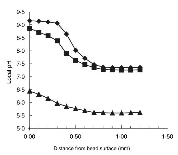 因此,從圖6和圖7可見,可以改變介質外部pH,使得生長在周圍介質和珠外圍不利,而生長和乳酸生產在珠內部繼續。這種情況改變了細胞釋放速率與乳酸生產速率的比值,導致產物流包含更少自由細胞。這些實驗也說明,從圖7和圖8可見,固定化由于擴散限制和伴隨的珠內pH梯度導致pH操作范圍的大偏移。