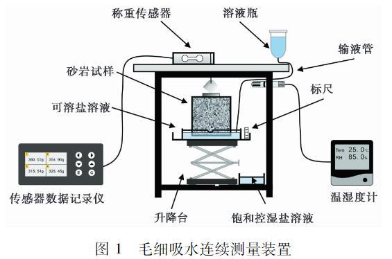 毛細吸水連續測量裝置由有機玻璃試驗箱、浸潤部分和稱重記錄部分組成。試驗箱預留了數個小孔,以供KE-COS-03溫濕度遠程監控儀和梁式稱重傳感器的安裝,通過在內置的溶液槽內倒入相應的飽和鹽溶液,即可使箱體內部溫濕度在預定范圍內保持相對穩定。箱體內部放置有“回”形浸潤槽及升降臺,可溶鹽溶液通過輸液管與浸潤槽相連,并在浸潤槽內側設置有5 mm深的泄液槽,保持浸潤槽內的溶液高度穩定,槽外側粘接標尺,以便觀測試樣表面毛細吸水高度的變化。安裝于箱體頂部的梁式稱重傳感器通過高強聚乙烯繩與下部試樣連接。當試樣因毛細吸水而發生質量改變時,梁式傳感器所輸出的電信號將由外部線路傳至HY-R200T多路信號記錄儀中。