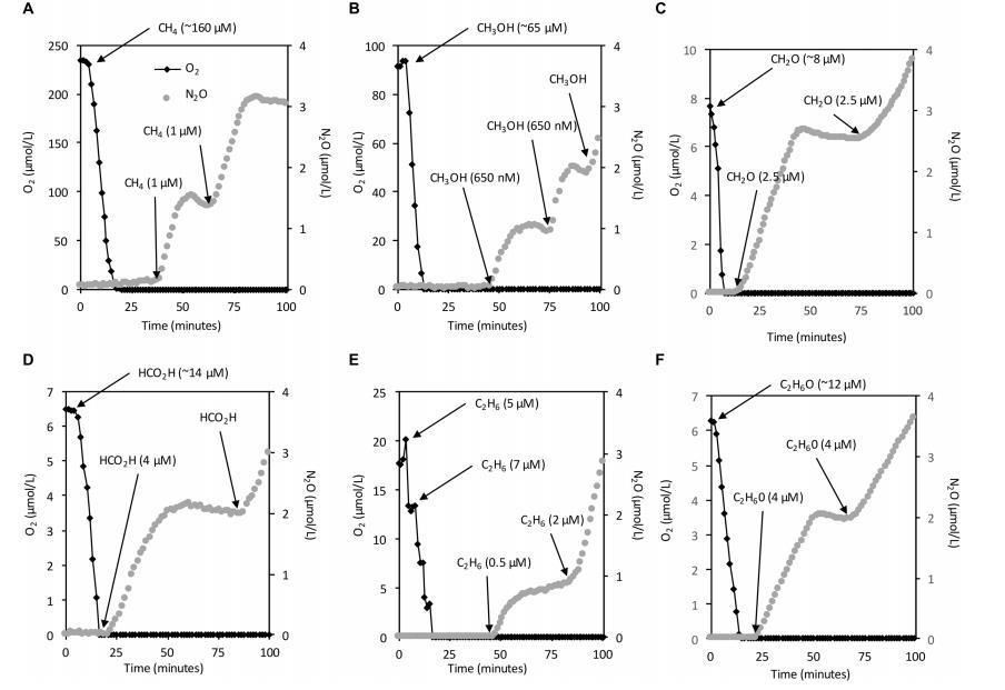 使用上述相同的設(shè)置,我們向MR腔室中的靜息細(xì)胞補(bǔ)充CH3OH、CH2O、HCO2H、C2H6或C2H6O,以通過實(shí)驗(yàn)驗(yàn)證除CH4以外的其他碳基還原劑源是否支持M.album菌株BG8的脫氮作用。此外,為了證實(shí)我們測試的所有一碳和兩碳源都可以在缺氧條件下作為M.album菌株BG8脫氮作用的直接電子供體,我們向靜息細(xì)胞提供僅夠消耗MR腔室中存在的溶解O2的還原劑,而不留多余的還原劑來支持脫氮作用(圖3)。然后,我們通過向含有補(bǔ)充了NaNO2的培養(yǎng)基的MR腔室中連續(xù)添加少量CH4、CH3OH、CH2O、HCO2H、C2H6或C2H6O來測量瞬時(shí)N2O產(chǎn)生(圖3)。對(duì)于所有六種底物,N2O的產(chǎn)生與添加的底物量是化學(xué)計(jì)量關(guān)系的(圖3)。