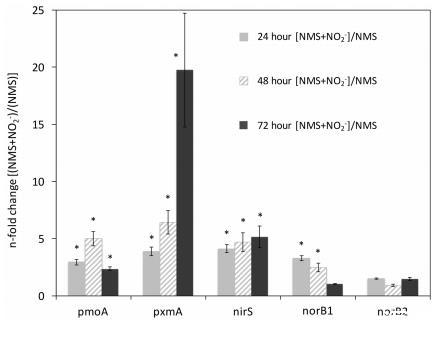 為了評(píng)估添加NO2-對(duì)基因表達(dá)的影響,我們使用在單獨(dú)NMS中生長的培養(yǎng)物作為對(duì)照。生長24小時(shí)后,NMS和NMS+NO2-培養(yǎng)物頂空中的O2濃度分別約為17.2%和16.9%(圖1B)。在添加NO2-的培養(yǎng)物中,pmoA、pxmA、nirS和norB1的轉(zhuǎn)錄水平在24和48小時(shí)時(shí)間點(diǎn)顯著高于單獨(dú)NMS的培養(yǎng)物(圖5)。在72小時(shí)時(shí)間點(diǎn),與單獨(dú)NMS培養(yǎng)物相比,NMS+NO2-中pmoA和nirS的轉(zhuǎn)錄水平仍然顯著升高,而norB1的表達(dá)不再顯著升高(圖5)。最有趣的是,在72小時(shí)時(shí),pxmA的轉(zhuǎn)錄本豐度在NMS+NO2-中比在單獨(dú)NMS培養(yǎng)物中高19.8倍(圖5)。第二個(gè)norB拷貝(norB2)在所有采樣時(shí)間點(diǎn)對(duì)NO2-添加均無響應(yīng)(低于兩倍)。