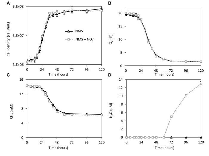 在120小時(shí)內(nèi)培養(yǎng)Methylomicrobium album菌株BG8,以確定NO2-對(duì)生長、O2和CH4消耗以及N2O產(chǎn)生的影響(圖1)。保持總氮量恒定以消除處理間氮可用性和鹽濃度的差異。所有培養(yǎng)物起始的氧氣張力為19.5±0.7%(圖1B)。正如先前觀察到的,添加NO2-對(duì)M.album菌株BG8的生長或底物消耗沒有抑制作用(圖1A-C)。所有培養(yǎng)物中的限制性底物是O2,這通過在生長48小時(shí)后向培養(yǎng)物補(bǔ)充額外的O2并觀察到與未接收額外O2的培養(yǎng)物相比光密度顯著增加來證明。N2O的產(chǎn)生僅發(fā)生在NMS加NO2-的培養(yǎng)物中(圖1D)。當(dāng)O2達(dá)到頂空的約1.8%時(shí),在添加NO2-的培養(yǎng)物頂空中首次出現(xiàn)N2O產(chǎn)生,并以每小時(shí)每個(gè)細(xì)胞9.3×10^-18 mol N2O的速率持續(xù)到實(shí)驗(yàn)結(jié)束(120小時(shí))(圖1D)。生長120小時(shí)后,在NMS+NO2-培養(yǎng)物中,添加的NO2-的N2O產(chǎn)率百分比為5.1±0.2%。