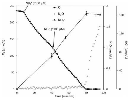 許多甲烷氧化菌,包括M.album BG8,由于與氨氧化細(xì)菌具有同源基因庫,可以將NH3氧化為NO2-。我們旨在測試來自NH3氧化的還原劑和NO2-是否也能驅(qū)動(dòng)M.album菌株BG8的脫氮作用。將NH4Cl注入MR腔室后,腔室中的靜息細(xì)胞迅速消耗溶解O2(圖4)。約70分鐘后,生物質(zhì)將溶解O2消耗至<50 nM,NO2-濃度達(dá)到163±5μM。O2耗盡后N2O的產(chǎn)生速率為每小時(shí)每個(gè)細(xì)胞1.2 x 10^-18 mol。