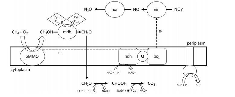 瞬時O?消耗和氧化亞氮產生的測量結果為C1-C2底物和氨的分解代謝在M.album菌株BG8中與低氧條件下的NO??還原直接耦合提供了強有力的支持。一些好氧甲烷氧化菌發酵CH?并排泄有機化合物,如檸檬酸鹽、乙酸鹽、琥珀酸鹽和乳酸鹽。一些研究還表明,脫氮作用僅發生在以甲烷喂養的含有甲烷氧化菌和反硝化菌的共培養物中,因為過去認為甲烷氧化菌無法厭氧分解有機化合物。盡管M.album菌株BG8在提供CH?的缺氧條件下可能排泄有機化合物,但CH?OH、CH?O、HCO?H、C?H?、C?H?O或NH?氧化支持脫氮作用的能力明確證明了甲烷氧化菌特異性酶學與單個生物體內脫氮活性之間的聯系。