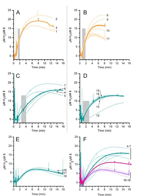 圖5、通過克拉克型氫傳感器檢測到的化學式氫析出現象。氫氣在化學還原劑[Eu(EGTA)]2-的存在下由2和3發生演變。亮色痕跡是單獨的測量值;暗色痕跡則是重復測量的平均值。1至15號痕跡是在同一天記錄的,因此更具可比性。16至18號痕跡是在另一天記錄的。數字與表S1中的樣本編號相對應。陰影灰色區域顯示了用于繪制線性曲線以確定表1中所報告的氫產量速率的數據。(A)復合物2,pH值7。(B)復合物2,pH值8。(C)復雜物3,pH值7。(D)復雜物3,pH值8。(E)復雜物3,在不同日期的pH值為7時的情況。(F)所有氫氣釋放痕跡(4-7—藍色,痕跡4-7)以及(16-18—紫色,痕跡16-18)均針對pH值為7的3號樣品。