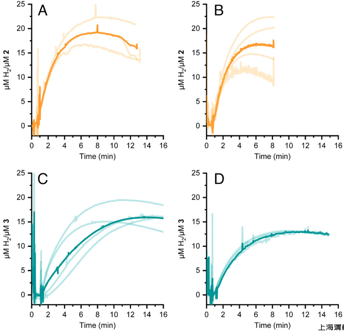 圖4、通過添加化學還原劑[Eu(EGTA)]誘導的HER 2(面板A和B)和3(面板C和D)。pH值為7(面板A和C)或8(面板B和D)。每個光跡代表獨立的檢測;粗體為光線痕量的平均值。