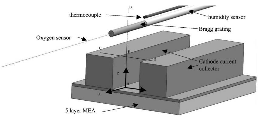 極化、剖面和瞬態(tài)測量期間平面陰極和傳感器組件的相對位置詳見圖4。傳感器組件包括氧氣傳感器毛細(xì)管、帶有濕度敏感布拉格光柵的光纖以及帶有導(dǎo)線的熱電偶。傳感器始終彼此平行并與陰極肋平行排列。在所有實(shí)驗(yàn)過程中,傳感器之間的相對排列保持固定。幾何點(diǎn)A(y=0~mm,z=0~mm),B(y=0~mm,z=sim 6~mm),C(y=-1.52~mm,z=sim 0.16~mm),D(y=1.52~mm,z=0.16~mm)和E(y=0~mm,z=1.6~mm)定義了實(shí)驗(yàn)過程中傳感器組件(以布拉格光柵的幾何中心為參考)的軌跡和位置(所有實(shí)驗(yàn)中x=0~mm)。線EB和CD分別代表z(垂直)和y(水平)移動過程中傳感器組件的軌跡。相對濕度z剖面是使用改進(jìn)的傳感器組件沿AB線測量的。在極化和瞬態(tài)掃描期間,傳感器組件位于點(diǎn)E。坐標(biāo)系原點(diǎn)位于陰極活性區(qū)域的幾何中心,光纖接觸陰極網(wǎng)的頂部。