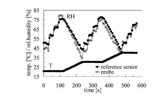 圖2顯示了在典型校準(zhǔn)過程中,參考傳感器隨時(shí)間變化的相對濕度和溫度讀數(shù),以及光纖濕度探針經(jīng)溫度校正后的相對濕度讀數(shù)。濕度每240分鐘在40%到70%之間循環(huán),而溫度在540分鐘內(nèi)從20°C變化到40°C。探針與參考傳感器吻合良好,證實(shí)了相對濕度測量已針對溫度進(jìn)行了校正。lambdao,kRH和kT的典型值分別為1500~nm、sim 1 pm/%RH和sim 10 pm/^circC。傳感器的響應(yīng)時(shí)間受限于獲得中心波長測量的皮米分辨率所需的采樣和平均。校準(zhǔn)后,我們估計(jì)相對濕度讀數(shù)的絕對精度約為pm 12%RH。