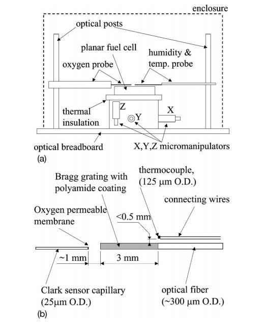 實(shí)驗(yàn)設(shè)置—圖3a示意性地說明了自呼吸燃料電池陰極微傳感器探測實(shí)驗(yàn)的配置。平面自呼吸燃料電池附著在XYZ微操作臺上方,開放式陰極端面朝上。電池通過絕緣層與XYZ臺熱絕緣,并通過外殼與環(huán)境對流屏蔽。溫度、氧分壓和相對濕度傳感器安裝在剛性光學(xué)立柱上,這些立柱又固定在一個(gè)剛性光學(xué)面包板上。所有三個(gè)傳感器對齊,使它們匯聚在自呼吸燃料電池陰極中心部分上方的一小片空間區(qū)域。傳感器的相對位置在圖3b中以放大細(xì)節(jié)顯示。自呼吸燃料電池放置在連接到同一光學(xué)面包板底座的XYZ臺上,確保了一個(gè)堅(jiān)固、機(jī)械完整的剛性組裝體。XYZ臺允許精確控制陰極表面和傳感器之間的位移。Clark毛細(xì)管傳感器和光纖布拉格傳感器以共線方式排列,傳感器尖端之間的間距小于一毫米。熱電偶導(dǎo)線在空氣中與光纖平行布線。實(shí)際的熱電偶位于布拉格光柵起點(diǎn)上方不到半毫米處,位于光纖上方。整個(gè)實(shí)驗(yàn)裝置被遮蔽在一個(gè)部分封閉的結(jié)構(gòu)內(nèi),以最小化實(shí)驗(yàn)室環(huán)境中發(fā)生的強(qiáng)制流動對燃料電池陰極上方自然對流羽流的影響。