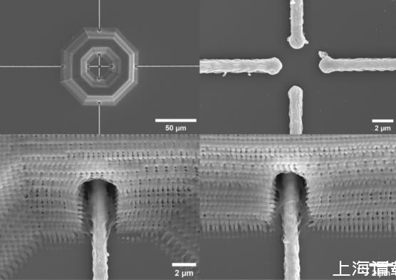 圖3是實(shí)施例1提供的三維集成化細(xì)胞電生理平臺中,激光直寫鉑線的三維微電極-微支架結(jié)構(gòu)和鉑線從微支架底部預(yù)留凹槽穿越的微觀形貌照片;