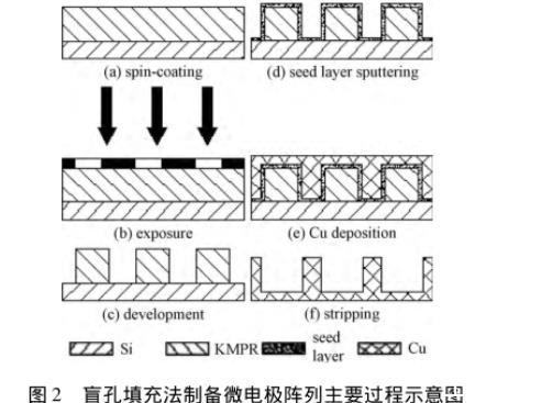 圖2盲孔填充法制備微電極陣列主要過程示意圖