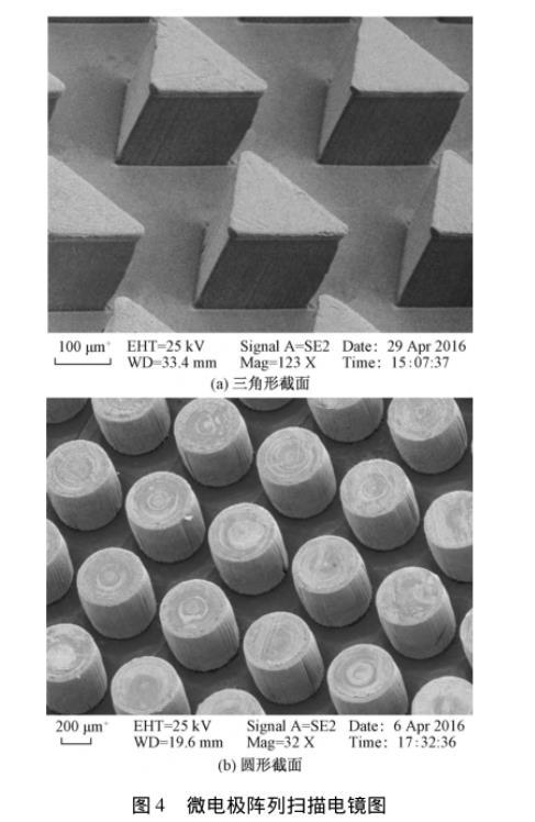圖4是去除KMPR膠模后的微電極掃描電鏡照片。圖4(a)是截面為正三角形的陣列電極,三角形邊長為200μm,中心距為353μm,高度為180μm,圖4(b)是截面為圓的陣列電極,圓直徑為200μm,中心距為400μm,高度為180μm。由于金屬基底是在電極上方形成的,所以不會出現電極脫落的現象。