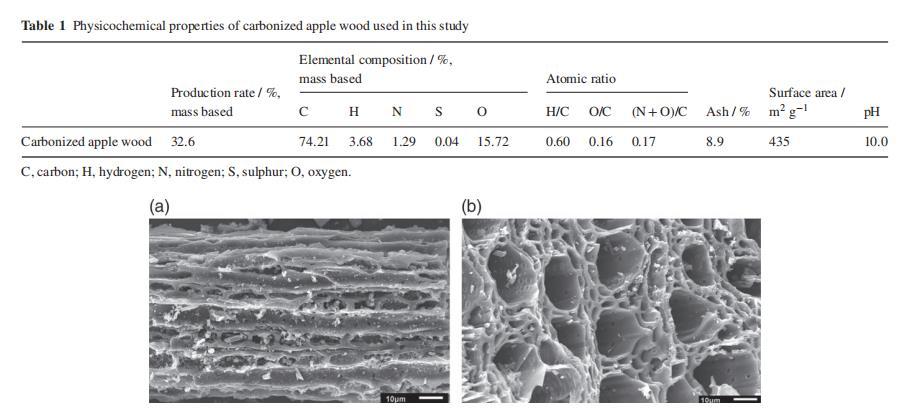 土壤采集自中國山東省泰安市(北緯36°10′,東經(jīng)117°07′)一處耕地的0-20厘米深度。該土壤為砂質(zhì)粘壤土(粘土12.8%,粉砂25.3%,砂61.8%),根據(jù)Shi等人的分類屬于褐土,Leptic Luvisol。土壤pH為7.1,含有總有機碳7.20 g kg?1,有效磷32.9 mg kg?1,有效氮26.6 mg kg?1,有效鉀102.5 mg kg?1,有機質(zhì)12.41 g kg?1。碳化蘋果木是通過在N?環(huán)境中,于高溫碳化爐(Dotrust DC-B,中國北京)中700°C處理磨碎的冬季修剪蘋果枝條2小時制備的,定義為CAW。表1呈現(xiàn)了CAW的元素組成。CAW的掃描電子顯微鏡分析顯示存在獨特的排列有序的蜂窩狀孔隙,這可能代表了原料生物毛細管結(jié)構(gòu)的碳質(zhì)骨架。