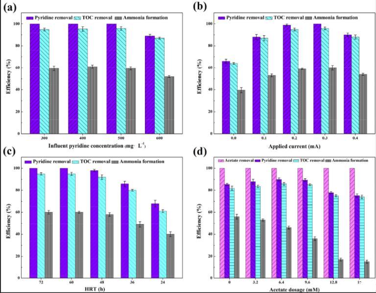 圖2. (a)吡啶濃度、(b)施加電流、(c)水力停留時間、(d)乙酸投加量對厭氧反應器中吡啶降解、TOC去除及氨氮生成的影響