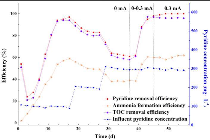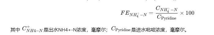 吡啶和TOC去除效率根據Shen等人(2015)確定,氨形成效率(FE_{NH4+-N})由以下公式計算: