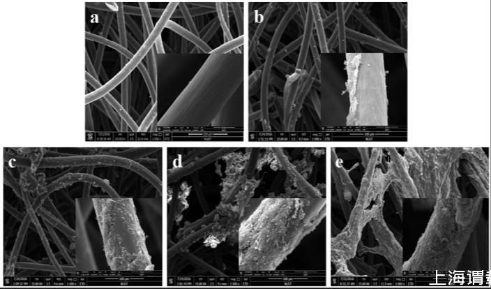 圖3. (a)空白玻璃纖維、(b)未通電生物陰極和(c)未通電生物陽極的SEM圖像,以及(d)電刺激后生物陰極和(e)電刺激后生物陽極的SEM圖像。
