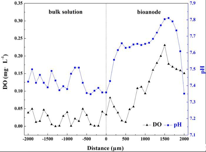陽極在厭氧系統(tǒng)中的作用不僅作為替代終端電子受體,也是產(chǎn)氧場所,導(dǎo)致陽極周圍微環(huán)境變化。使用微電極測量進行生物陽極中氧濃度和pH變化測試。如圖4所示,本體溶液中氧濃度始終低于0.05毫克/升,表明反應(yīng)器中嚴格厭氧條件。當(dāng)生物陽極深度從0到1500微米時,氧濃度快速從0.03增加至0.23毫克/升。氧分布表明生物陽極內(nèi)部,即近陽極表面,產(chǎn)生氧氣,在陽極區(qū)創(chuàng)造更缺氧條件。向陽極引入氧氣有益于頑固有機物降解。適當(dāng)量的氧氣可刺激細菌生長或幫助底物利用范圍擴展。然而,應(yīng)注意,當(dāng)生物陽極深度從1500到2000微米時,氧濃度快速從0.23降低至0.15毫克/升。推測氧濃度下降是由于生物膜內(nèi)好氧和兼性細菌代謝消耗。pH值分布趨勢與氧濃度相似。由于合成廢水中磷酸鹽緩沖液,本體溶液pH穩(wěn)定在7.35-7.51。然而,pH值從生物陽極表面的7.36增加至1600微米深度處的7.81,這可能源于吡啶生物礦化過程中NH4-N釋放。當(dāng)生物陽極深度達到2000微米時,pH值回到7.35,這可能源于兩個原因。首先,陽極產(chǎn)生氧氣時,同時產(chǎn)生一部分質(zhì)子。其次,推測堿性氨通過生物氨去除過程被去除,導(dǎo)致pH降低。此過程也可能消耗生物陽極中的氧氣,假定為1500-2000微米深度氧濃度下降的另一原因。
