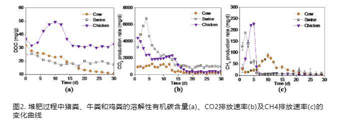 CO?排放速率的演變表明,三種畜禽糞便的礦化速率隨堆肥時(shí)間顯著下降。前15天內(nèi),豬糞的CO?產(chǎn)生速率降低了90.4%,雞糞降低了85.6%,牛糞降低了81.6%。這一結(jié)果可能與可用有機(jī)物含量和水分減少有關(guān)。整個(gè)測(cè)試期間,豬、雞和牛糞的CO?累積排放量分別為62.0 g、41.9 g和16.9 g。
