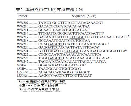 使用引物對WW216/WW217和WW218/WW219(圖1B),以M.catarrhalis ATCC 43617基因組DNA為模板,通過PCR擴增包含aniA ORF立即5'和3'核苷酸序列的DNA片段。這兩個DNA片段用作重疊延伸PCR的模板,使用引物WW216和WW219。所得擴增子命名為DANIA,包含一個內部SmaI位點,用BamHI和SacI消化,然后連接到用相同限制酶消化的pWW115中。連接反應混合物用于電轉化M.catarrhalis ETSU-9。從一個壯觀霉素抗性克隆中分離的質粒命名為pWW121,將上述kan盒克隆到pWW121 DNA插入片段中的SmaI位點。所得重組質粒命名為pWW122,其kan盒以與缺失的aniA基因相同的方向插入,用作PCR擴增模板,使用引物WW216和WW219。所得PCR產物命名為DANIA-KAN,用于轉化M.catarrhalis野生型菌株O35E和ETSU-9??敲顾乜剐赞D化子通過錨定PCR和核苷酸序列分析確認為aniA突變體(圖1D)。