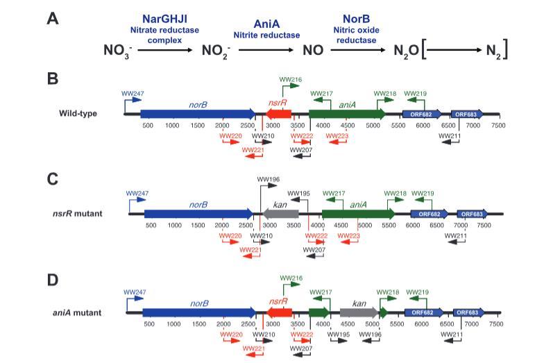 圖1.卡他莫拉菌參與截短反硝化途徑的基因產物及相關突變體構建示意圖。(A)卡他莫拉菌的截短反硝化途徑包含圖示的前三個酶促步驟,該菌明顯缺乏將N2O還原為N2的能力(括號標示)。(B至D)分別顯示(B)野生型O35E菌株、(C)O35E nsrR突變體和(D)O35E aniA突變體中包含norB、nsrR和aniA基因及其側翼區域的染色體位點示意圖。PCR所用不同引物的相對位置通過箭頭標示。
