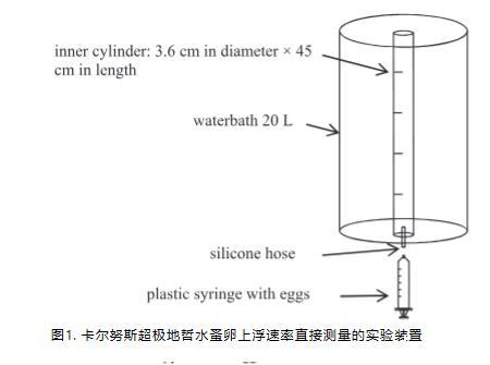成熟雌體于2012年9月8日使用Bongo網從500至800米水深處捕獲。它們立即被分選并單獨培養在800毫升黑色Nunc瓶中,瓶中裝滿來自800米處的現場水。雌體被帶到丹麥,在黑暗和低溫下儲存,直到實驗開始。每2-3天,用移液管從瓶子頂部取出10毫升水,計數其中的卵,并添加新的現場水。實驗于11月21日至23日在4°C的恒溫恒光條件下進行。上升速率在一個標有每5厘米刻度的有機玻璃管中測量,該管粘在一個20升有機玻璃圓柱體的底部。