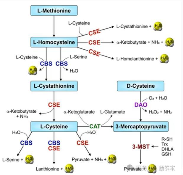 外源性合成則主要依賴于微生物,尤其是腸道菌群。這是腸道內H?S濃度顯著高于其他部位的主要原因。一方面,腸道中的硫酸鹽還原菌(SRB)能以硫酸鹽為底物,還原產生H?S。另一方面,口腔及腸道中的部分厭氧菌可通過對含硫氨基酸(如半胱氨酸、甲硫氨酸)的分解代謝生成H?S。一個值得注意的代謝交互是,部分H?可在腸道微生物作用下轉化為H?S和CH?。