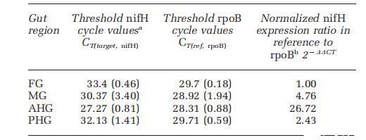 首先通過將甲蟲在15N2頂空環境中孵育12天,然后解剖并對提取的腸道RNA進行整體同位素比質譜分析,來分析固氮作用。所有四個區域都顯示出15N2富集。盡管由于需要較長的孵育時間(約12天)才能達到15N檢測,從這些分析中確認N2固定活性的位置很困難。為了評估每個腸道區域的N2固定潛力,通過qPCR評估了nifH基因表達,并標準化為rpoB基因的表達。在整個腸道中,FG中的表達水平最低;其CT值用作相對定量的校準品(表2)。相對于FG,AHG中的nifH表達高出26.7倍,MG中高出4.7倍,PHG中高出2.4倍。通過克隆和系統發育分析鑒定了N2固定類群。