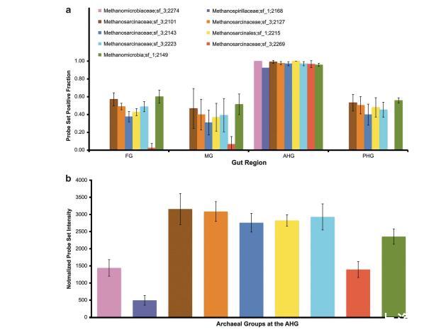 需氧類群如放線菌目(Actinomycetales)、伯克霍爾德菌目(Burkholderiales)、根瘤菌目(Rhizobiales)、著色菌目(Chromatiales)、固氮螺菌目(Azospirillales)、慢生根瘤菌目(Bradyrhizobiales)和亞硝化單胞菌目(Nitrosomonadales)在腸道的兩端(FG和PHG)富集,而在中央區域(MG和AHG)豐度較低。厭氧細菌類群包括擬桿菌目(Bacteroidales)、梭菌目(Clostridiales)、螺旋體目(Spirochaetales)、脫硫桿菌目(Desulfobacterales)、脫硫單胞菌目(Desulfomonadales)、互營桿菌目(Syntrophobacterales)和熱袍菌目(Thermotogales),相對于MG和PHG,在AHG中富集。產甲烷菌,包括甲烷微菌科(Methanomicrobiaceae)、甲烷螺菌科(Methanospirillaceae)和甲烷八疊球菌科(Methanosarcinaceae),僅在AHG中檢測到(圖6a和b)。