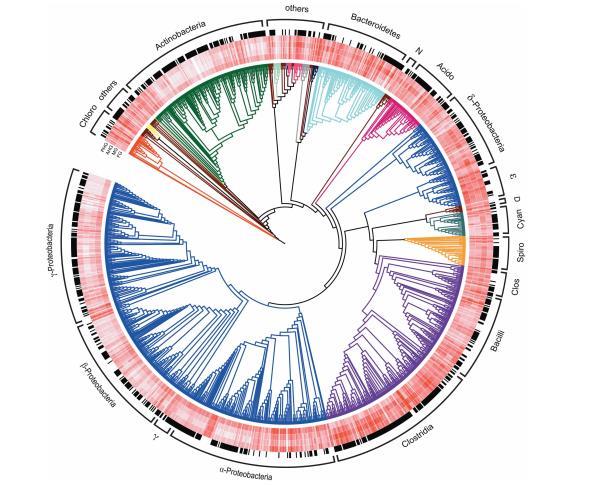 所有16個腸道區域的層次聚類(圖3)表明,FG和AHG形成了兩個不同的簇,而MG和PHG群落沒有被解析,而是按單個甲蟲聚集在一起。特定分類群的相對豐度(探針集強度)在不同腸道區域之間也存在統計學差異。檢測到的分類群的系統發育樹顯示了四個腸道區域中細菌分類群的平均相對豐度(白色到紅色的梯度環表示相對豐度增加;圖4)。