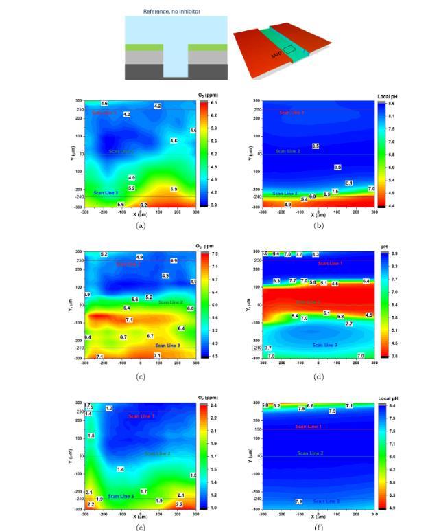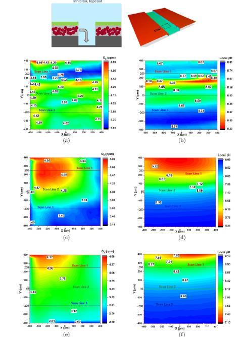 圖4、無抑制劑參考樣本的SECM:AA2024-T3涂層缺陷中pH和O2濃度表面掃描的頂視圖,時間點為1小時、1.5小時和4小時。(a)1小時時的氧濃度,(b)1小時時的pH,(c)1.5小時時的氧濃度,(d)1.5小時時的pH,(e)4小時時的氧濃度,(f)4小時時的pH。