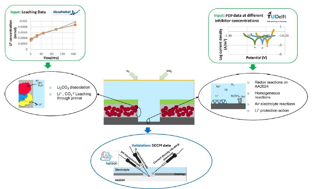 研究簡介:六價鉻因致癌性被國際法規(guī)限制,急需開發(fā)綠色抑制劑。鋰碳酸鹽能在鋁表面形成偽勃姆石(PB)和層狀雙氫氧化物(LDH)保護層,但其釋放速率、局部pH變化及與涂層體系的協(xié)同作用尚不明確。本研究論文通過FEM模擬與微區(qū)電化學驗證,填補了抑制劑在缺陷區(qū)內(nèi)動態(tài)行為預測的空白。針對航空工業(yè)中傳統(tǒng)六價鉻腐蝕抑制劑的毒性問題,提出以環(huán)保型鋰碳酸鹽(Li?CO?)作為替代方案,通過實驗與有限元模型(FEM)相結(jié)合的方法,系統(tǒng)研究其在AA2024-T3鋁合金涂層缺陷中的腐蝕保護機制。研究旨在量化鋰碳酸鹽的釋放動力學、局部保護效果及關(guān)鍵影響因素,為涂層設計提供理論依據(jù)。研究人員結(jié)合動電位極化(PDP)與鋰浸出實驗獲取模型輸入?yún)?shù),建立二維FEM模型(COMSOL Multiphysics),模擬電極反應、物種擴散及抑制劑釋放。模型涵蓋涂層(底漆+面漆)、電解質(zhì)和金屬界面,包含17種化學物種的反應(如水解、鋰鹽溶解)。驗證階段采用掃描電化學顯微鏡(SECM)和掃描振動電極技術(shù)(SVET),實時測量缺陷區(qū)的pH、氧濃度和電流密度。本研究構(gòu)建了可擴展的FEM工具箱,適用于其他抑制劑體系的預測。理論貢獻在于明確了鋰碳酸鹽保護的核心參數(shù)(Li?濃度、pH),但模型未涵蓋長期LDH穩(wěn)定性及實際環(huán)境波動數(shù)據(jù)。未來工作需整合合金異質(zhì)性,提升局部腐蝕預測精度。